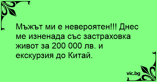 Мъжът ми е невероятен!!! Днес ме изненада със застраховка живот за 200 000 лв. и екскурзия до Китай.