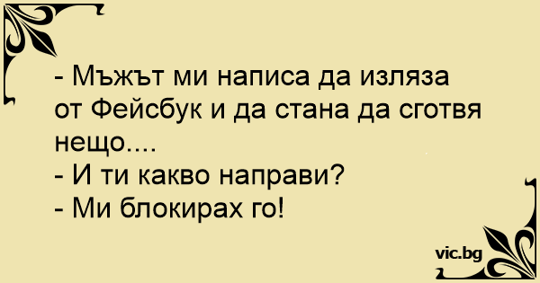 - Мъжът ми написа да изляза от Фейсбук и да стана да сготвя нещо.... - И ти какво направи? - Ми блокирах го!