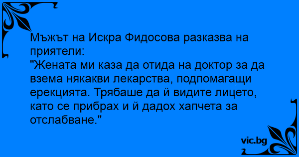 "Жената ми каза да отида на доктор за да взема някакви лекарства, подпомагащи ерекцията. Трябаше да й видите лицето, като се прибрах и й дадох хапчета за отслабване."