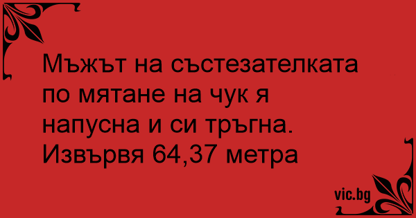 Мъжът на състезателката по мятане на чук я напусна и си тръгна. Извървя 64,37 метра 1 0 0 Вицове с Черен хумор