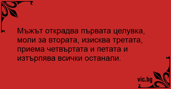 Мъжът открадва първата целувка, моли за втората, изисква третата, приема четвъртата и петата и изтърпява всички останали.