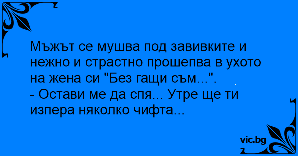 Sotul intra in pat Si-i sopteste sotiei la ureche: - Sunt Fara chiloti. Sotia , pe jumatate Adormita: - Lasa-ma sa dorm , maine am Sa-ti spal o pereche.