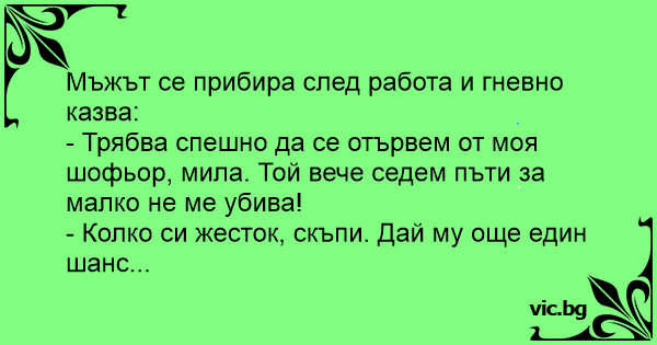 Vīrs: - «Esmu nolēmis atlaist savu šoferi. Viņš jau trīs reizes izraisījis avāriju. Knapi izdzīvojām.» Sieva: - «Tu gan esi nežēlīgs! Dod viņam vēl vienu iespēju!»