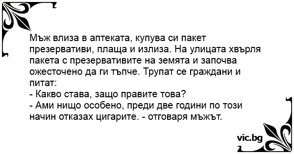 Мъж влиза в аптеката, купува си пакет презервативи, плаща и излиза. На улицата хвърля пакета с пpeзepbatиbиte на земята и започва ожесточено да ги тъпче. Трупат се граждани и питат: