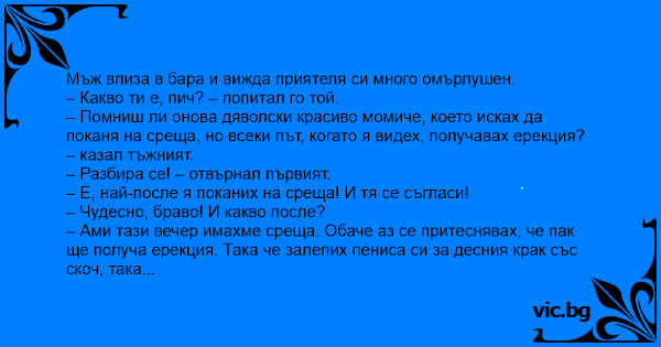 – Помниш ли онова дяволски красиво момиче, което исках да поканя на среща, но всеки път, когато я видех, получавах ерекция? – казал тъжният.