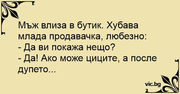 Мъж влиза в бутик. Хубава млада продавачка, любезно: