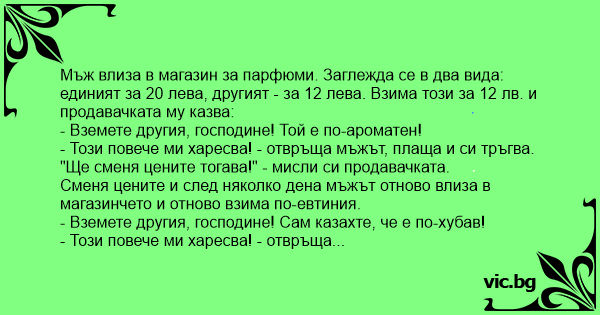 Мъж влиза в магазин за парфюми. Заглежда се в два вида: единият за 20 лева, другият - за 12 лева. Взима този за 12 лв. и продавачката му казва: