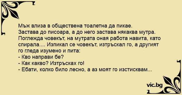 Застава до писоара, а до него застава някаква мутра. Поглежда човекът, на мутрата оная работа навита, като спирала.... Изпикал се човекът, изтръскал го, а другият го гледа изумено и пита: