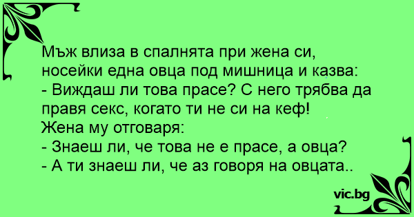Мъж влиза в спалнята при жена си, носейки една овца под мишница и казва:
