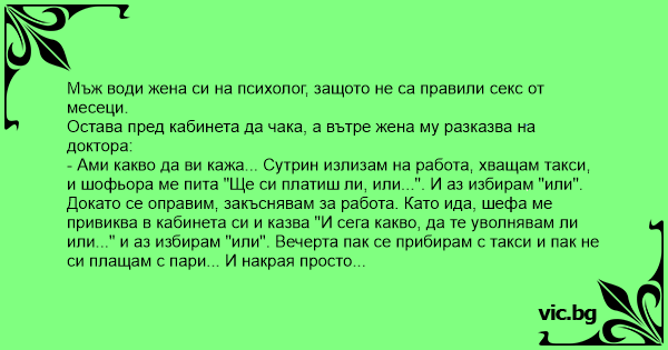 - Ами какво да ви кажа... Сутрин излизам на работа, хващам такси, и шофьора ме пита "Ще си платиш ли, или...". И аз избирам "или". Докато се оправим, закъснявам за работа. Като ида, шефа ме привиква в кабинета си и казва "И сега какво, да те уволнявам ли или..." и аз избирам "или". Вечерта пак се прибирам с такси и пак не си плащам с пари... И накрая просто нямам сили за мъжа ми.