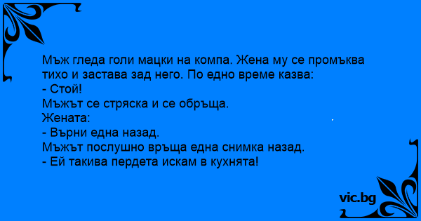 Мъж гледа голи мацки на компа. Жена му се промъква тихо и застава зад него. По едно време казва: