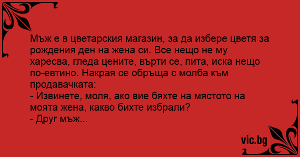 Мъж е в цветарския магазин, за да избере цветя за рождения ден на жена си. Все нещо не му харесва, гледа цените, върти се, пита, иска нещо по-евтино. Накрая се обръща с молба към продавачката: