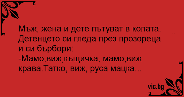 -Мамо,виж,къщичка, мамо,виж крава.Татко, виж, руса мацка...