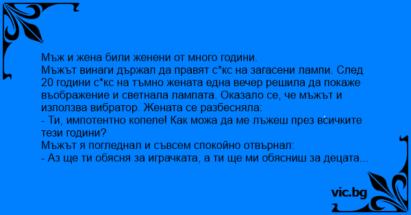 Мъжът винаги държал да правят cekc на загасени лампи. След 20 години cekc на тъмно жената една вечер решила да покаже въображение и светнала лампата. Оказало се, че мъжът и използва bибpatop. Жената се разбесняла: