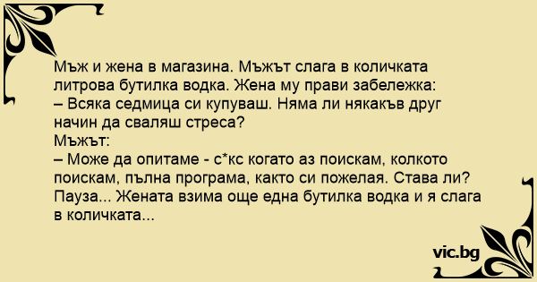 Мъж и жена в магазина. Мъжът слага в количката литрова бутилка водка. Жена му прави забележка: – Всяка седмица си купуваш. Няма ли някакъв друг начин да сваляш стреса? Мъжът: – Може да опитаме - cekc когато аз поискам, колкото поискам, пълна програма, както си пожелая. Става ли? Пауза... Жената взима още една бутилка водка и я слага в количката...
