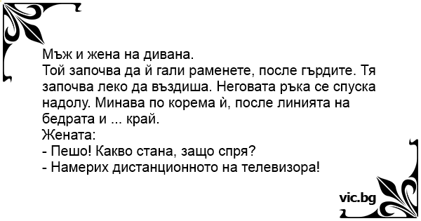 Szombat reggel a házaspár az ágyban lustálkodik, és a férj elkezd a feleség körül matatni. Finoman megcirógatja az oldalát, aztán megérinti a derekát, lenyúl a combjához. Az asszony kéjesen...