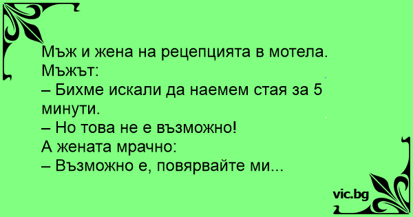 У готелі до портьє підходять хлопець і дівчина. Хлопець: — Я хотів би найняти номер на дві хвилини. Портьє: — Але це неможливо! Дівчина, похмуро: — Повірте мені, можливо.