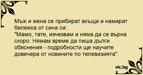 "Мамо, тате, изчезвам и няма да се върна скоро. Нямам време да пиша дълги обяснения - подробности ще научите довечера от новините по телевизията".