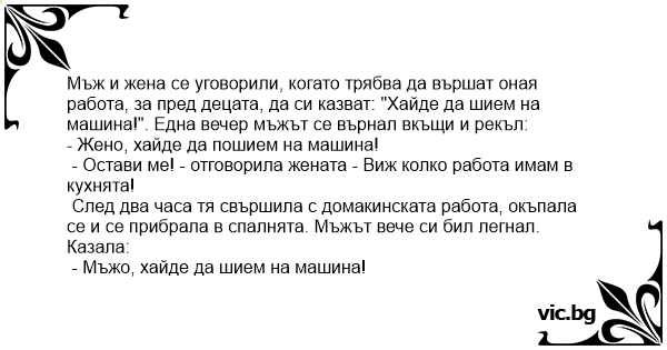 Мъж и жена се уговорили, когато трябва да вършат оная работа, за пред децата, да си казват: "Хайде да шием на машина!". Една вечер мъжът се върнал вкъщи и рекъл: