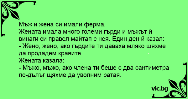 - Мъжо, мъжо, ако члeнa ти беше с два сантиметра по-дълъг щяхме да уволним ратая.