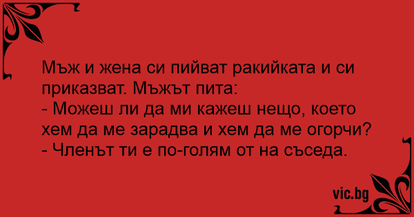 Чоловік розмовляє з дружиною: — Б'юся об заклад, ти не зможеш мені сказати в одному реченні таке, щоб одночасно мене порадувати і роздосадувати! — В тебе найбільший член з усіх твоїх друзів!