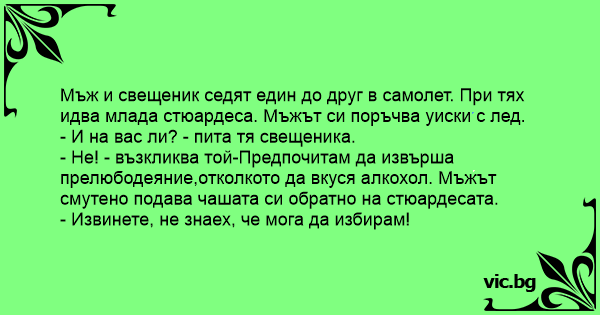 - Не! - възкликва той-Предпочитам да извърша прелюбодеяние,отколкото да вкуся алкохол. Мъжът смутено подава чашата си обратно на стюардесата.