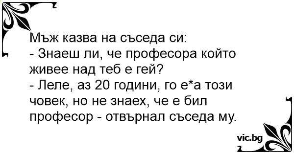 - Леле, аз 20 години, го eбa този човек, но не знаех, че е бил професор - отвърнал съседа му.