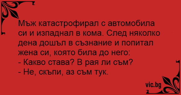 Мъж катастрофирал с автомобила си и изпаднал в кома. След няколко дена дошъл в съзнание и попитал жена си, която била до него: