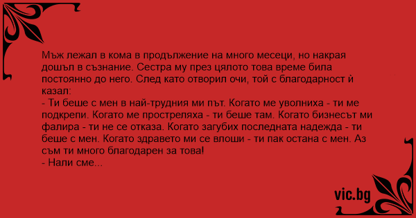 Мъж лежал в кома в продължение на много месеци, но накрая дошъл в съзнание. Сестра му през цялото това време била постоянно до него. След като отворил очи, той с благодарност ѝ казал: