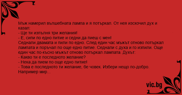 Мъж намерил вълшебната лампа и я потъркал. От нея изскочил дух и казал: