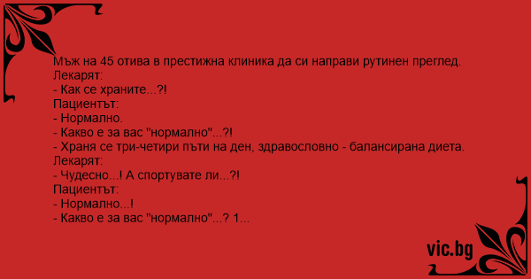 - На мен не ми изглежда много нормално - казва лекарят - на вашата възраст би било по-нормално да правите един-два пъти на седмица.