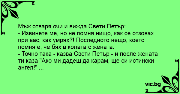 - Точно така - казва Свети Петър - и после жената ти каза "Ако ми дадеш да карам, ще си истински ангел!" ...
