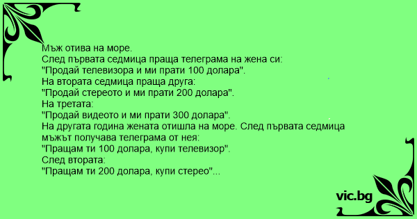 На другата година жената отишла на море. След първата седмица мъжът получава телеграма от нея: