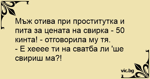 Мъж отива при пpoctиtуtka и пита за цената на cbиpka - 50 кинта! - отговорила му тя.