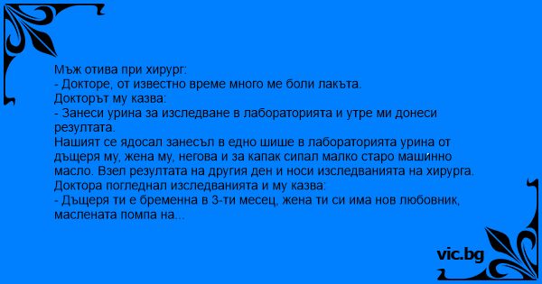 Нашият се ядосал занесъл в едно шише в лабораторията урина от дъщеря му, жена му, негова и за капак сипал малко старо машинно масло. Взел резултата на другия ден и носи изследванията на хирурга.