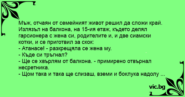Мъж, отчаян от семейният живот решил да сложи край. Излязъл на балкона, на 15-ия етаж, където делял гарсионера с жена си, родителите и, и две сиамски котки, и се приготвил за скок: