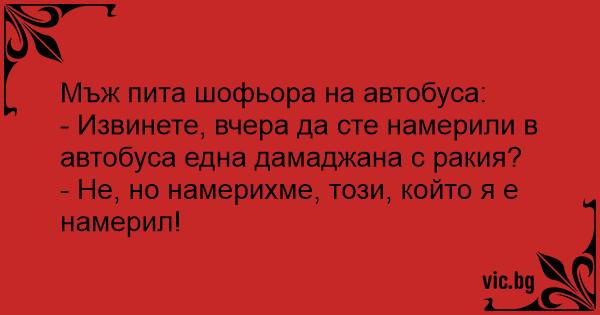 - Извинете, вчера да сте намерили в автобуса една дамаджана с ракия?