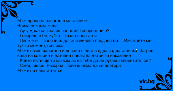 Мъжът взел папагала и влязъл с него в една задна стаичка. Загрял вода на котлона и натопил папагала вътре за наказание.