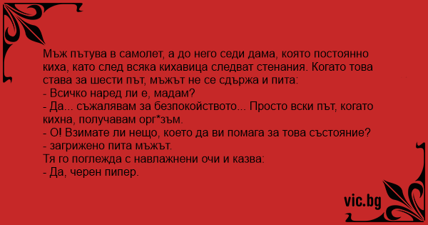 Мъж пътува в самолет, а до него седи дама, която постоянно киха, като след всяка кихавица следват стенания. Когато това става за шести път, мъжът не се сдържа и пита: