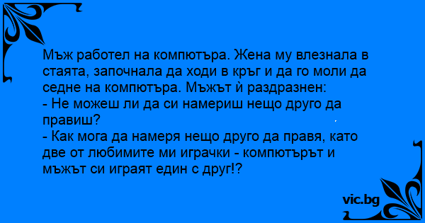 Мъж работел на компютъра. Жена му влезнала в стаята, започнала да ходи в кръг и да го моли да седне на компютъра. Мъжът ѝ раздразнен: