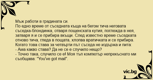 По едно време от съседната къща на бегом тича неговата съседка-блондинка, отваря пощенската кутия, поглежда в нея, затваря я и се прибира вкъщи. След известно време съседката отново тича, гледа в пощата, хлопва вратичката и се прибира. Когато това става за четвърти път съседа не издържа и пита:
