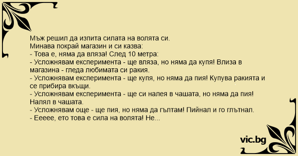 - Усложнявам експеримента - ще вляза, но няма да купя! Влиза в магазина - гледа любимата си ракия.