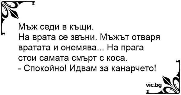 На врата се звъни. Мъжът отваря вратата и онемява... На прага стои самата смърт с коса.
