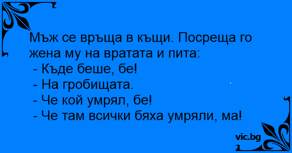 Пияница се прибира късно у дома. Жена му го чака с точилката: - Къде беше? - На гробищата. - Какво, да не е умрял някой? - Няма да повярваш направо... Там всички са умрели!