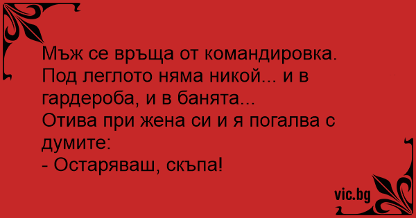 Маж се враќа од службено патување. Под креветот нема никој, ни во гардероберот, ни во бањата. Оди кај жена му и ја погалува со зборовите: - Старееш, мила!