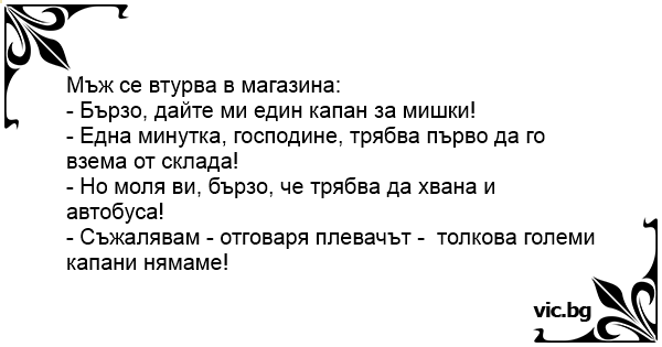 - Съжалявам - отговаря плевачът - толкова големи капани нямаме!