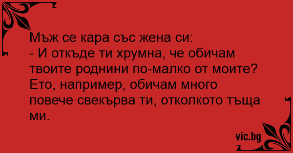 - И откъде ти хрумна, че обичам твоите роднини по-малко от моите? Ето, например, обичам много повече свекърва ти, отколкото тъща ми.