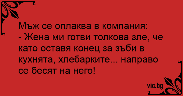 - Жена ми готви толкова зле, че като оставя конец за зъби в кухнята, хлебарките... направо се бесят на него!