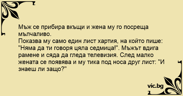 Мъж се прибира вкъщи и жена му го посреща мълчаливо.