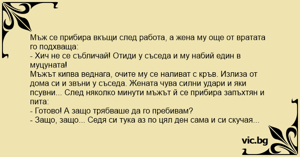 Мъжът кипва веднага, очите му се наливат с кръв. Излиза от дома си и звъни у съседа. Жената чува силни удари и яки псувни... След няколко минути мъжът й се прибира запъхтян и пита: